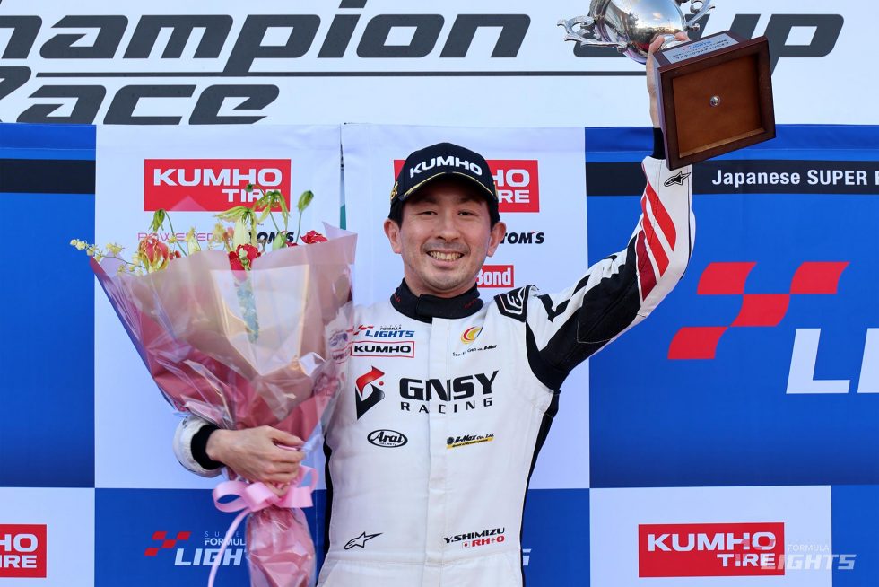 「スタートをうまく決めることができ、ポールポジションのKEN ALEX選手が動き出しが鈍かったので、そこでトップに立つことができました。序盤、松井選手がうしろにいましたが、そのまま先行させた後は逃げ切り……というレースでしたね。結果的にこの優勝でチャンピオンを決めることができましたが、チャンピオンという結果は一年間積み重ねて、我慢して努力をしていった先にしかないものなので、自分に対しても、これに賭けていったものが実って本当に良かったです。フォーミュラはブランク明けの2年目になりますが、自分自身まだまだ足りないところもあると思っていますし、DRAGON選手、今田選手に良い刺激と緊張感を与えていただきながらシーズンを戦うことができました。今回はKEN ALEX選手も出てきて速さをみせているので、頑張らなきゃと思いましたね。予選の後は僕も少し気持ちが沈んでいました(苦笑)。タイトルを決めることができたので、明日は少し心のブレーキをゆるめて頑張りたいと思います」